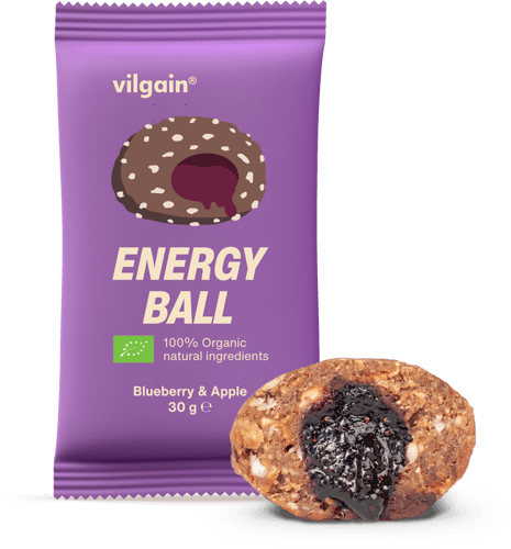 Vilgain Organic Energy Ball – Blueberry and Apple 30g is a vegan snack based on dates and almonds. The ball contains a fruity blueberry-apple jam filling and is made without refined sugar. It is suitable as a quick energy boost on the go or between meals.