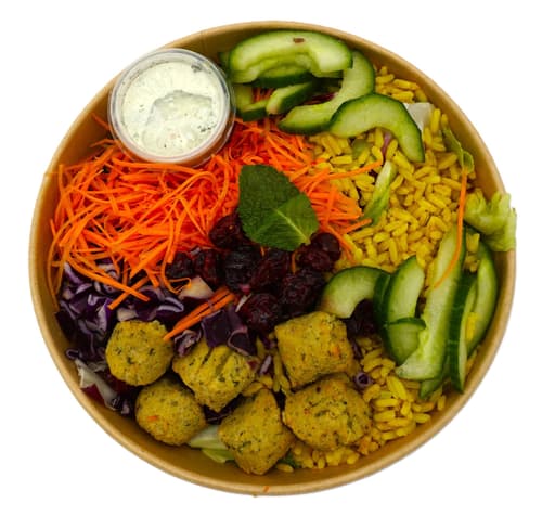Appearance: fresh, colourful bowl with rice, falafel and various toppings such as cucumber, red cabbage, carrots, cranberries and mint;