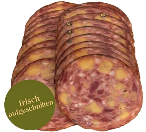 Guaranteed minimum durability from the time of delivery: 2 days.If the minimum durability is lower, please contact us and ask for a refund. Not applicable to items from the Save the Food section.Zutaten: 90g Rind und Schweinefleisch für 100g Endprodukt, 30g EMMENTALER, Speck, Wasser, Gewürze (SENF), Nitritpökelsalz (Kochsalz, Konservierungsstoff: E250), Stabilisatoren: E450, E451, E452; Antioxidationsmittel: E300, E301; Dextrose, Buchenholz