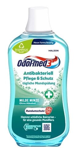 Odol-med3 Antibacterial Care & Protection Mouthwash inhibits the growth of harmful bacteria and thus supports healthy oral flora. The alcohol-free formula has an antibacterial effect on the tongue, teeth and in the interdental spaces and reaches places that the toothbrush cannot reach. In addition, fluoride remineralises tooth enamel, providing long-lasting protection against tooth decay. Use 2x daily. Rinse with 10 ml for 1 minute, then spit out. Do not swallow. Do not rinse with water.