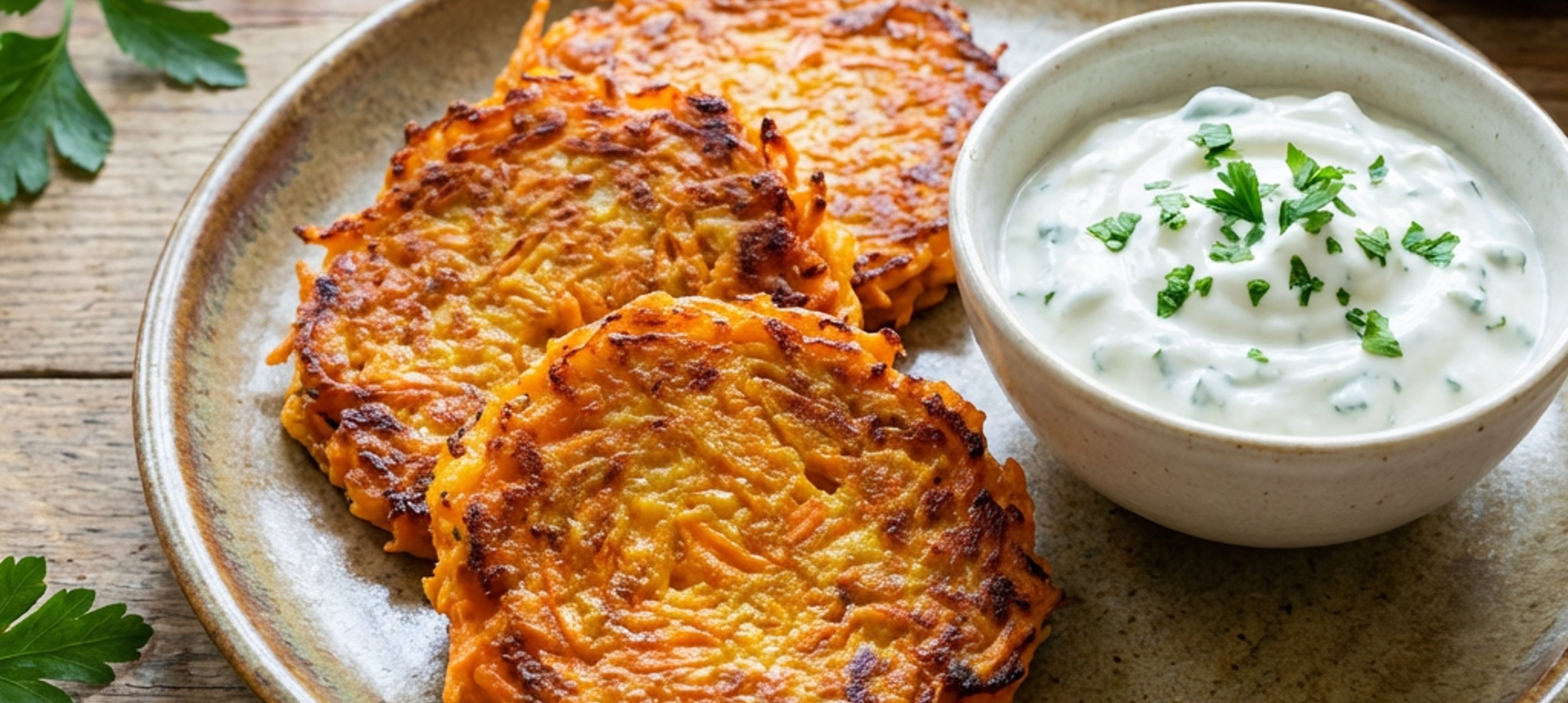 - 3Finally, prepare the dip: Mix the quark with the pressed garlic clove and finely chopped parsley. Season with salt. Serve the carrot fritters together with the quark dip.