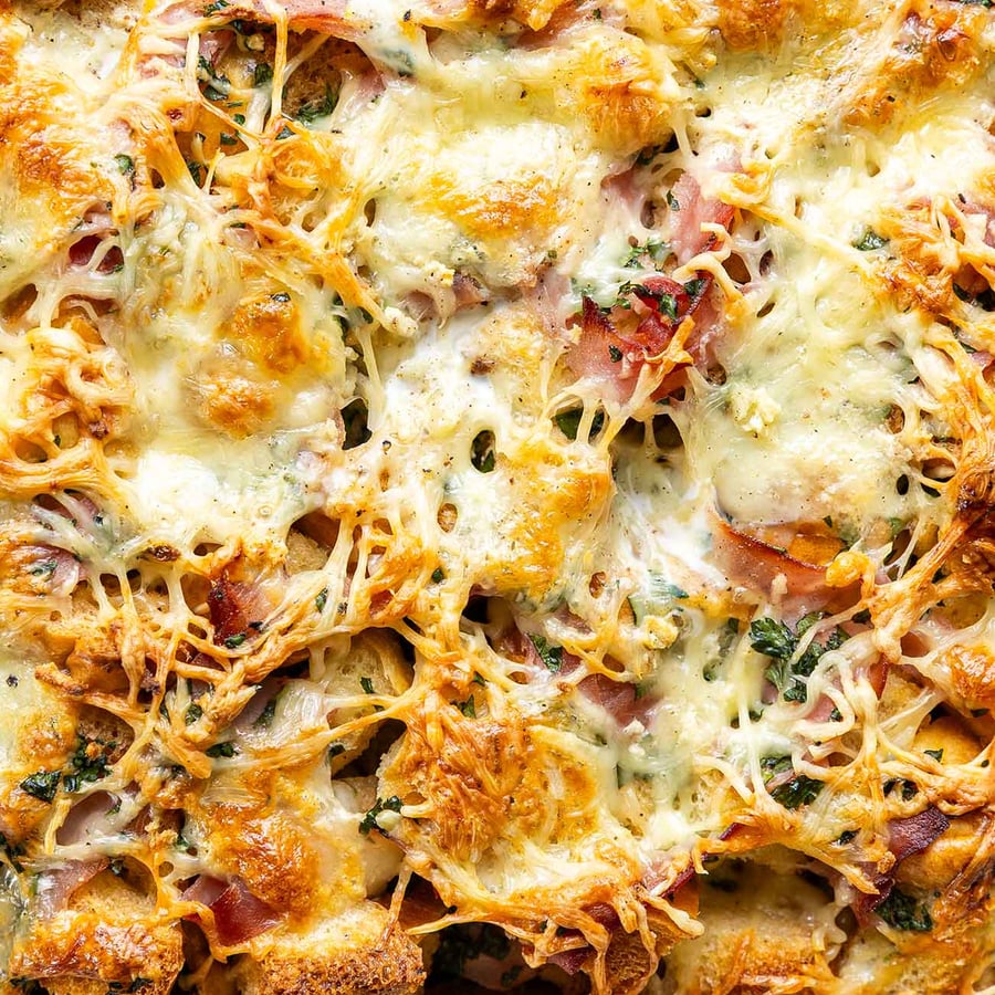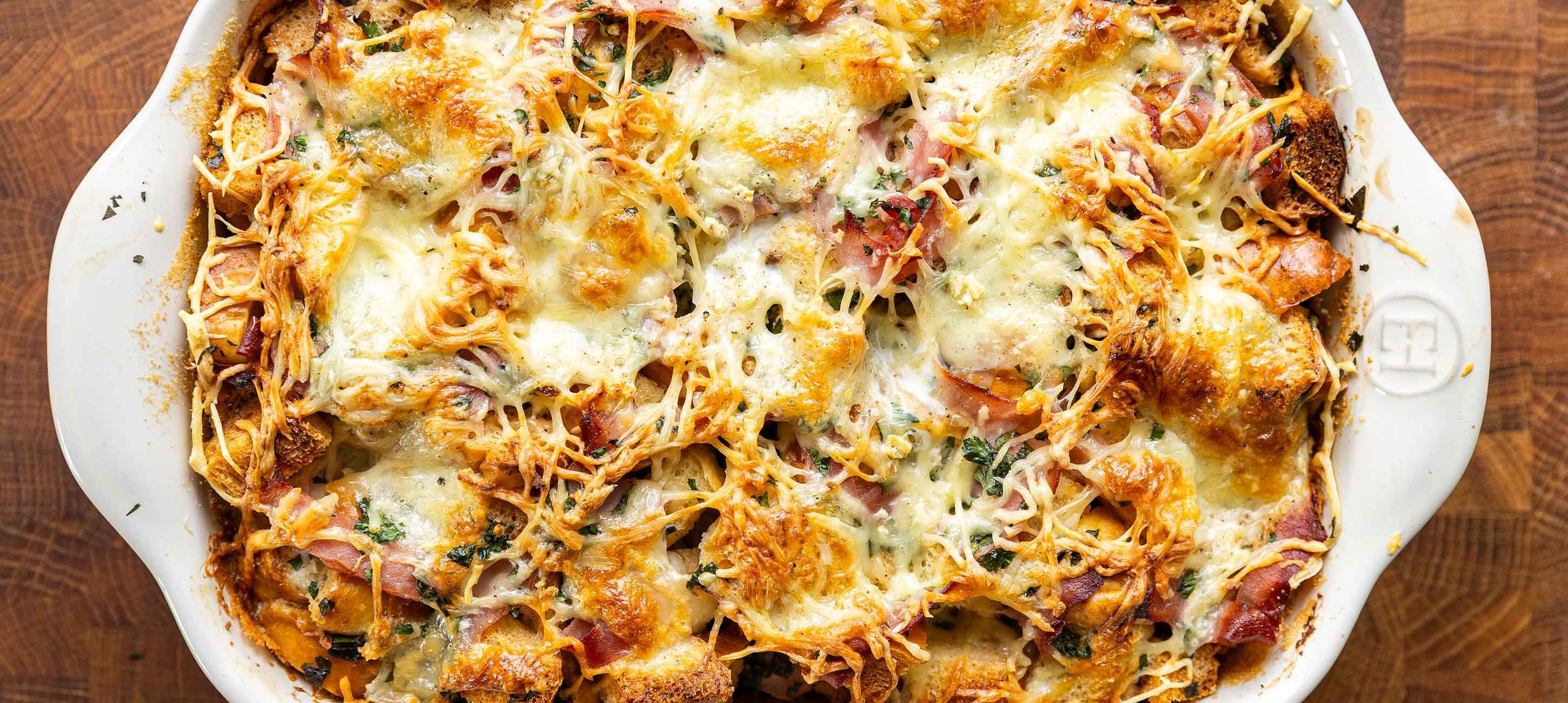 - 5In a bowl, whisk the eggs together with the whipping cream, milk, nutmeg, pressed garlic, salt, and pepper. Pour this mixture over the bread bake and place it in the oven.