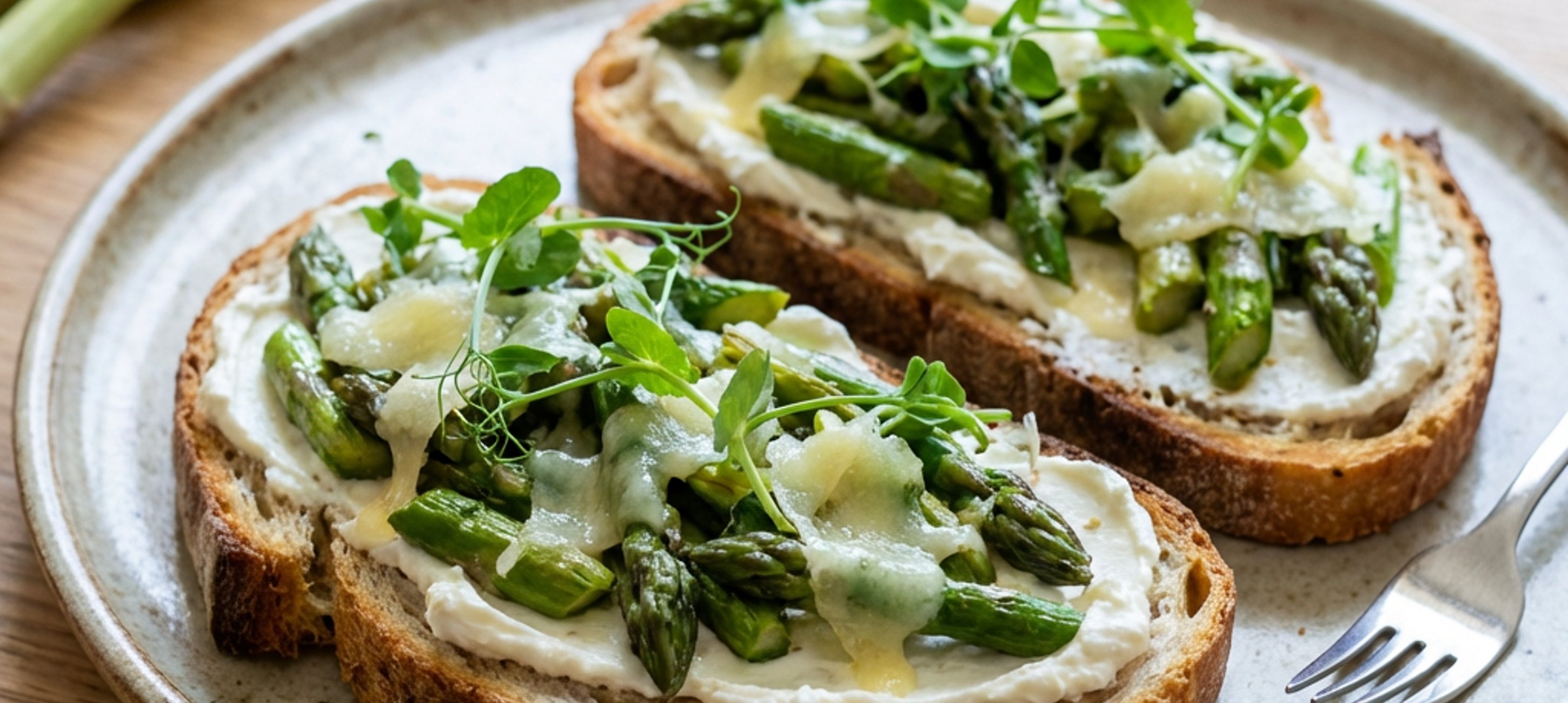 - 6Generously spread the toasted bread slices with cream cheese and top with the asparagus pieces.