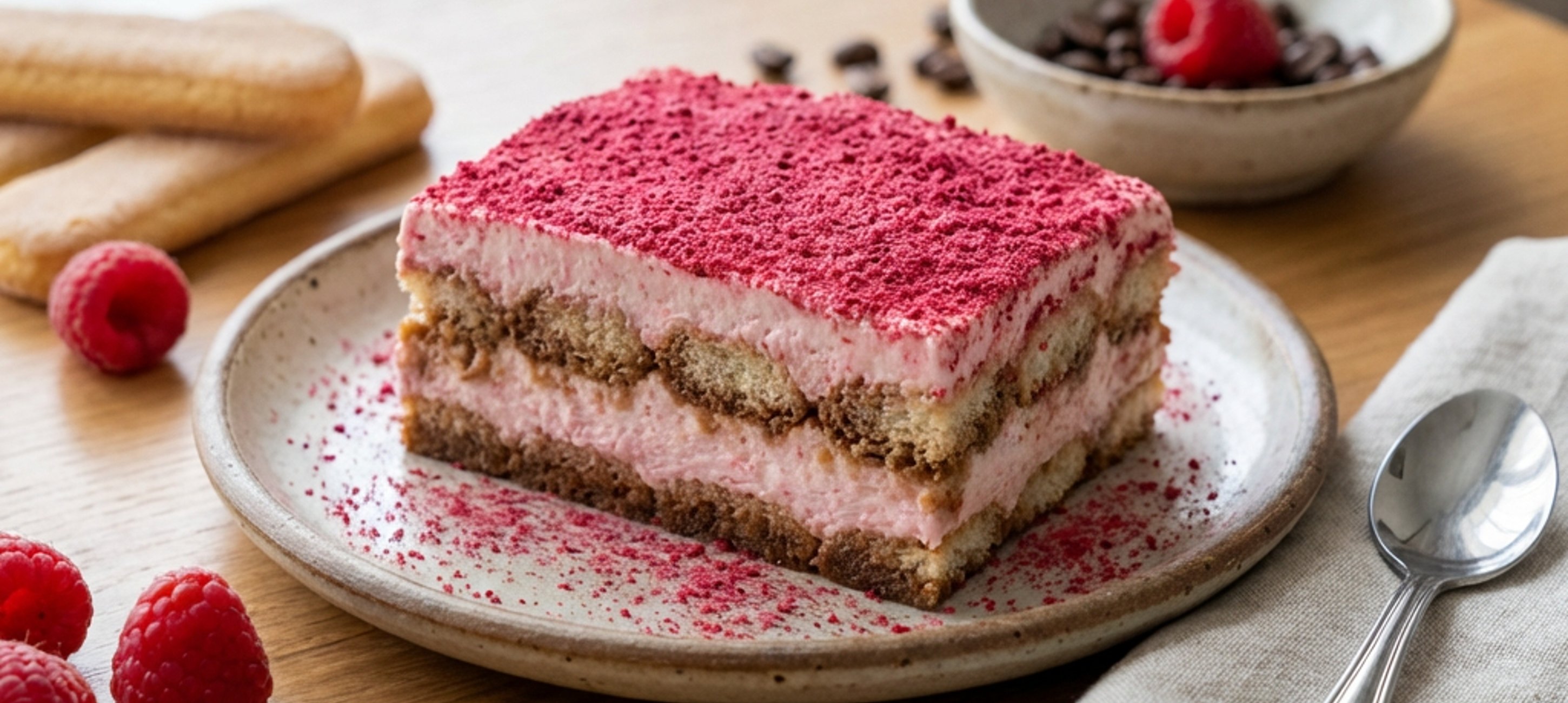 - 7Before serving, grind the remaining freeze-dried raspberries and dust the tiramisu with them.