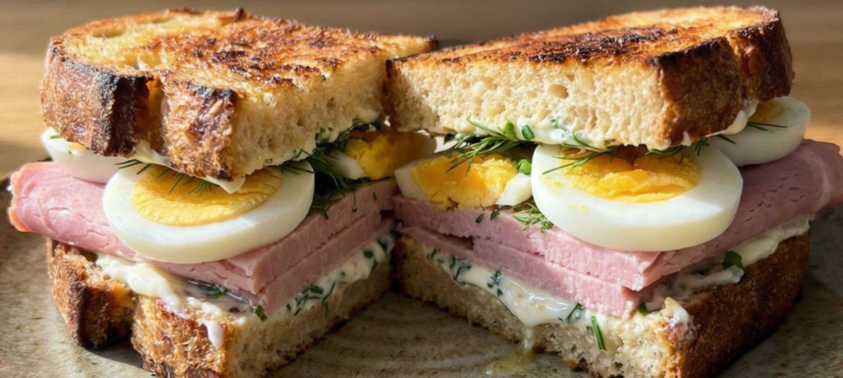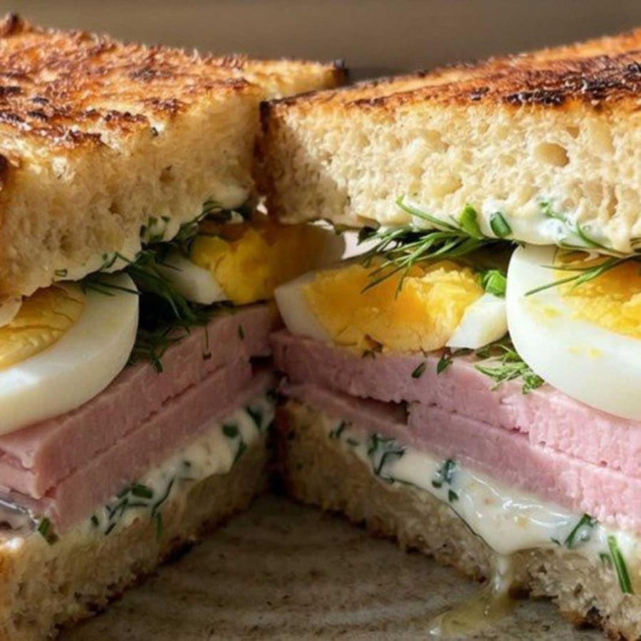 - 3Layer lettuce, ham slices, and egg slices on the bottom slice.