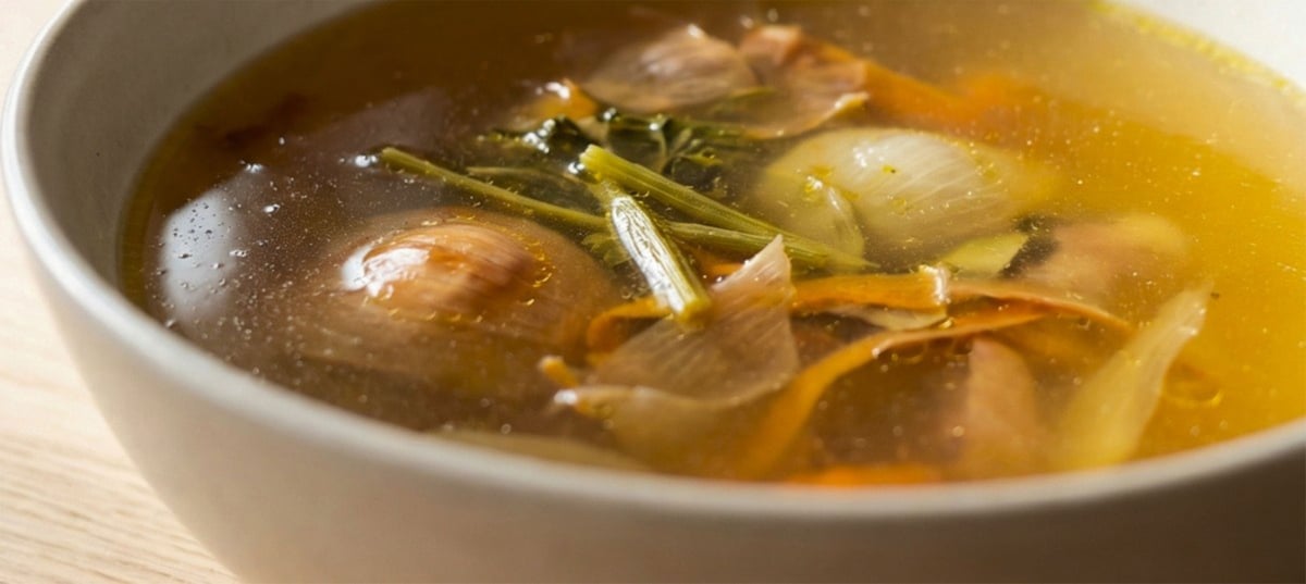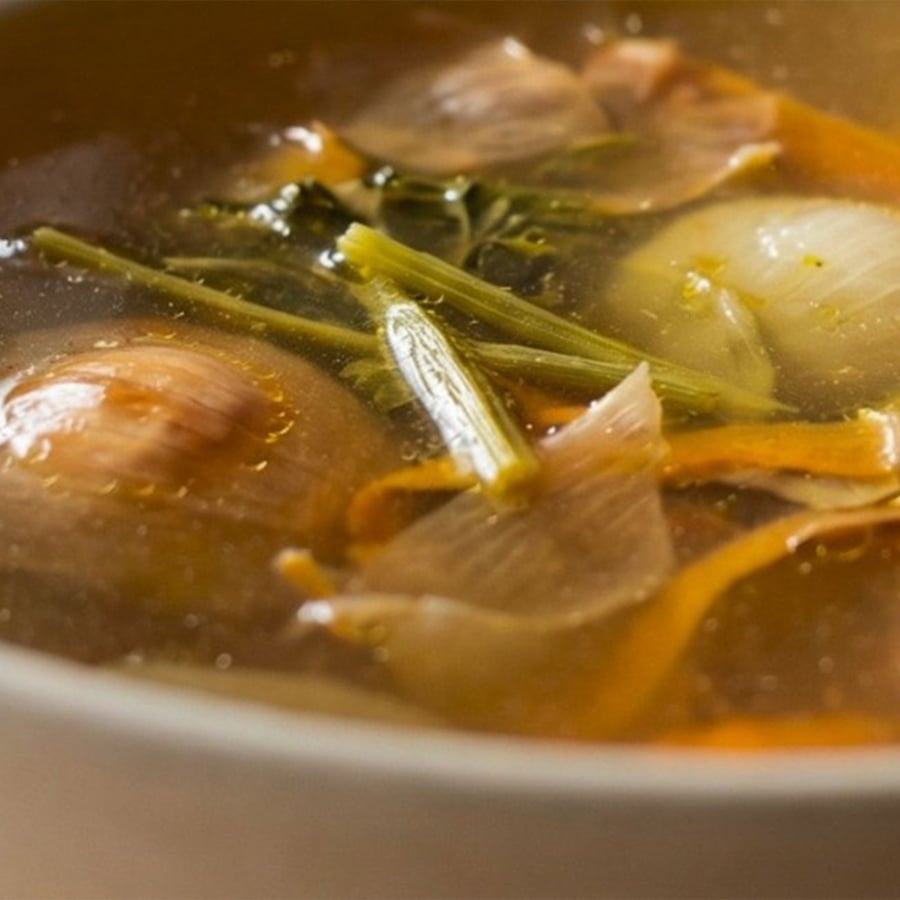 - 1Thoroughly wash the vegetable scraps. Halve the onion.