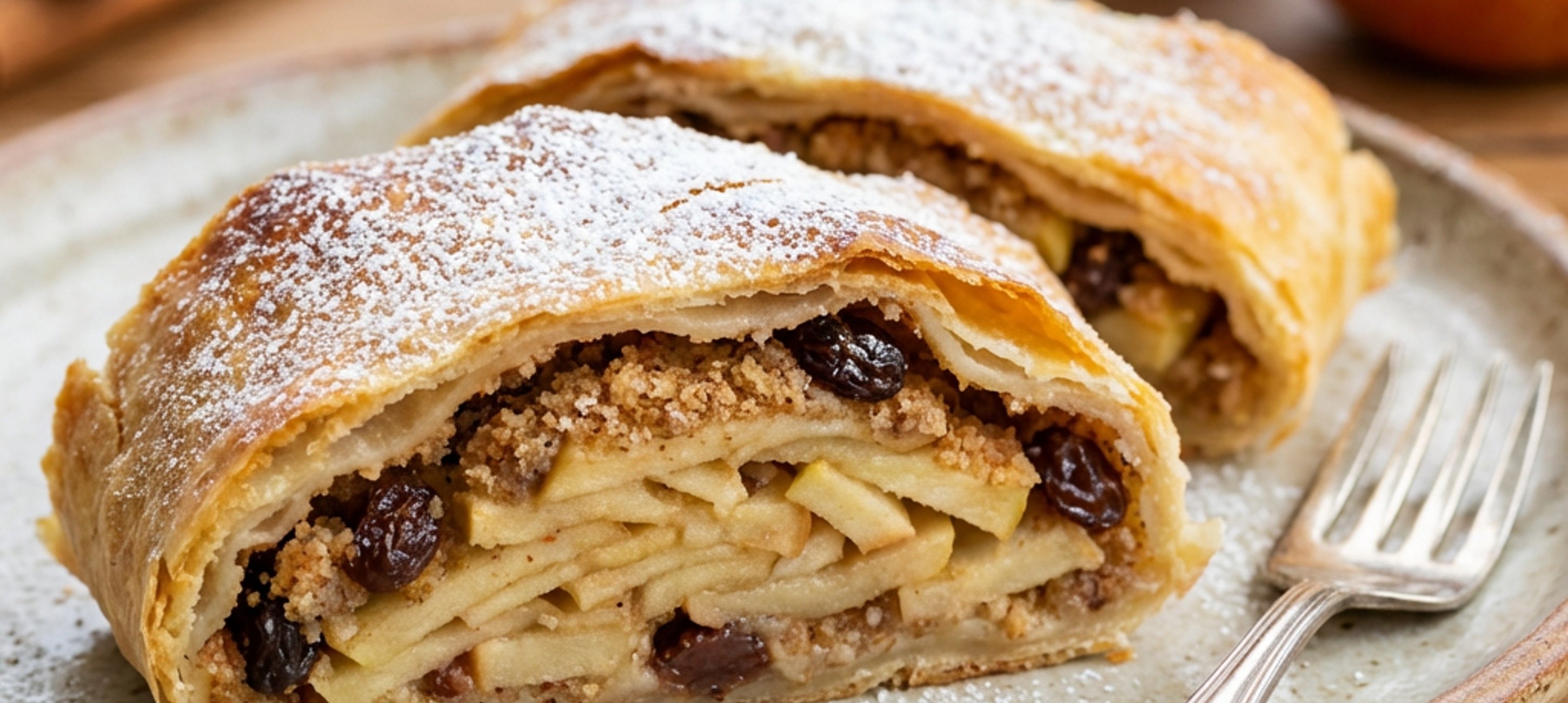 Apple strudel is best enjoyed with warm vanilla sauce.