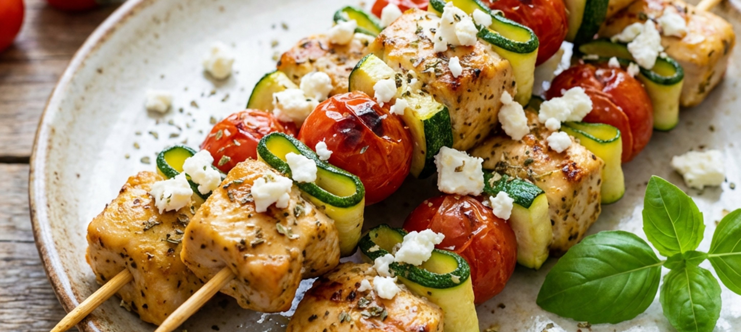 - 5Thread chicken, tomato, and zucchini slices alternately onto the skewers, folding the zucchini into an accordion shape.