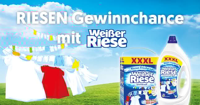 Ob als Gel, Duo-Caps oder Pulver – mit den Waschmitteln von Weißer Riese werden dank der hohen Ergiebigkeit Riesen-Wäscheberge wieder strahlend sauber. Und jetzt hast du auch die Möglichkeit mit dem Kauf von einem Weißen Riesen Produkt bei gurkerl.at riesig zu gewinnen!