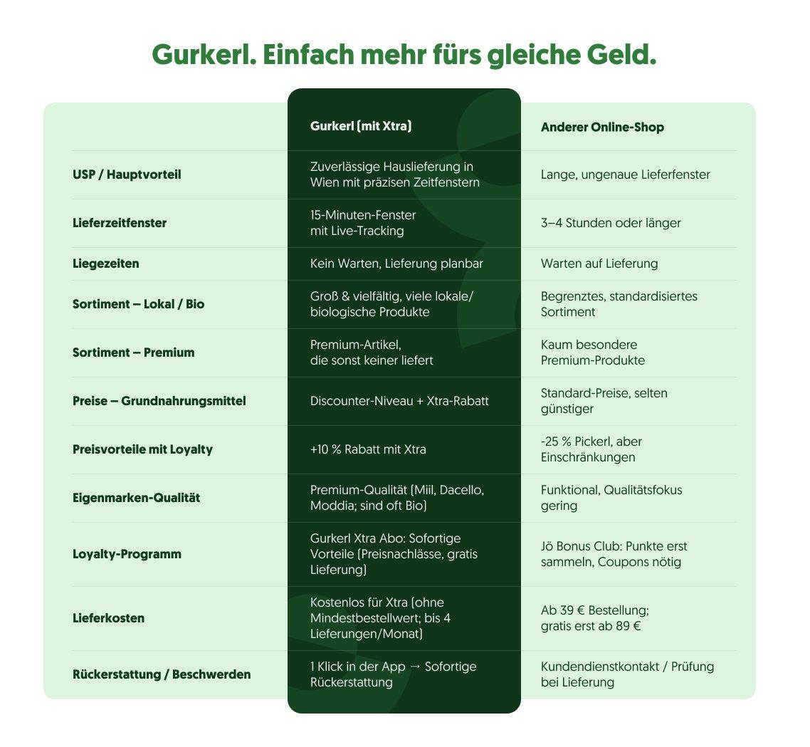 Manche Lebensmittellieferanten ziehen sich zurück, aber dein Alltag geht weiter. Gut, dass es eine Alternative gibt, auf die du dich verlassen kannst. Bei Gurkerl findest du alles für deinen täglichen Einkauf an einem Ort: frische Lebensmittel, starke Eigenmarken, bekannte Marken und sorgfältig ausgewählte Produkte aus der Region.