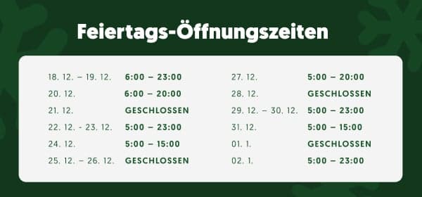 – damit du deine Festtags‑Einkäufe gut planen kannst, informieren wir dich über unsere angepassten Lieferzeiten zu Weihnachten und Silvester.